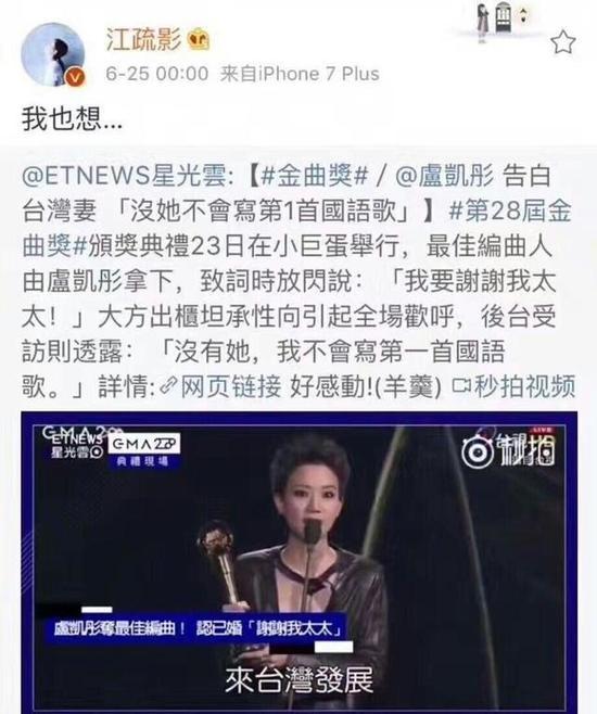我!也!想!这三个字真的有吓坏网友,不少网友调侃:"江江你是想得金曲奖,还是想……出柜啊??"不过也有网友猜测江疏影可能是被这动人的告白感动了吧,"我也想"可能是表达自己也想拥有这份浪漫的爱情呢?你怎么看?