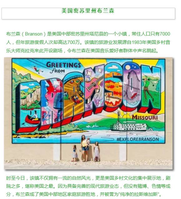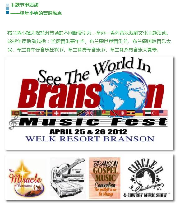 如今,到布兰森的游客首要目的是来欣赏音乐戏剧表演,其次才是观光、购物等,由于演出活动多在夜间开展的特点,其实现相对同类旅游小镇更高的游客过夜率。