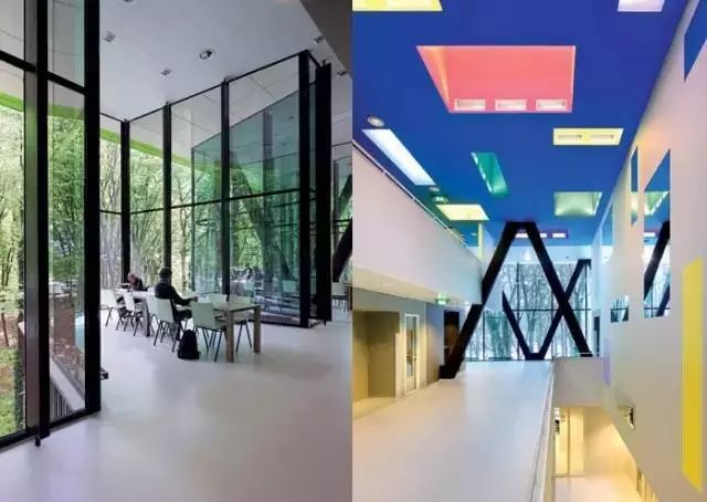 Groot Klimmendaa建筑身着棕色铝阳极,包括办公室,clinc,体育facilies,游泳池,餐厅和剧院等。建筑多采用透明玻璃,利于采光。