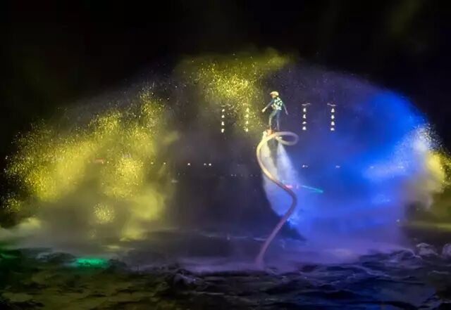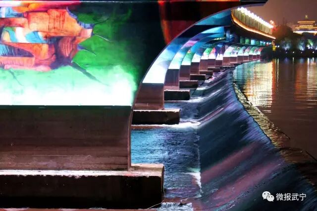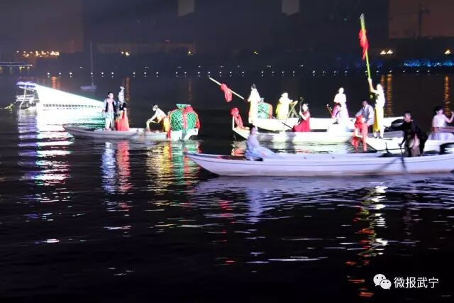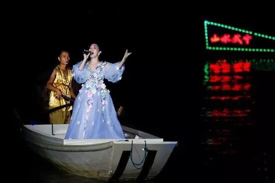与秦淮河不同,武宁的西海湾之夜闪烁在建筑与游船的各色各式光影中。一水两岸亭台楼宇客栈,酒吧歌厅茶楼,在水岸鳞次栉比排开;桥梁水上凌驾,戏台随波荡漾,都被装上灯光,一律倒在水波里,便光怪陆离、变幻莫测起来。清风徐来,水波不兴。坐上画舫游弋其间,在分不清是船在动还是两侧的建筑在变幻游走之际,你就不知不觉地醉了。