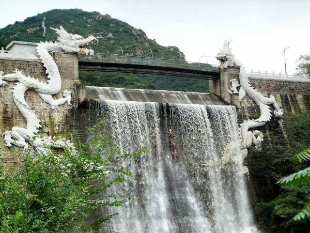 双龙壁是白龙潭水库的大坝,坝体上塑双龙。有须者年长,代表黑龙;无须者力弱,象征白龙。古时两龙争潭,现共处一坝,口喷水注,美其名曰“双龙嗽玉”。