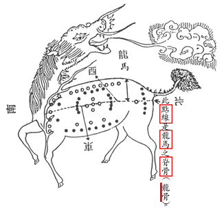 伏羲对日月星辰,季节气候,草木兴衰等等,有一番深入的观察。不过,这些观察并未为他理出所以然来。一天,黄河中忽然帮出了「龙马」,也就是这一刻,他突然发现自己正处于一种强烈的精神震憾之中,深切地感到了自身与所膜拜的自然之间,出现了一种莫名其妙的和谐一致。他发现龙马身上的图案,与自己一直观察万物自然的「意象」心得暗合,就这样,伏羲通过龙马身上的图案,与自己的观察,画出了「八卦」,而龙马身上的图案就叫做「河图」。在「山海经」中说「伏羲得河图,夏人因之,曰《连山》」。 伏羲的“经卦”是来源于天文现象,
