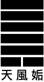 | 姤:女壮,勿用取女。 初六:系于金柅,贞吉,有攸往,见凶,羸豕孚蹢躅。 九二:包有鱼,无咎,不利宾。 九三:臀无肤,其行次且,厉,无大咎。 九四:包无鱼,起凶。 九五:以杞包瓜,含章,有陨自天。 上九:姤其角,吝,无咎。 |