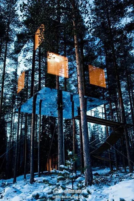 位于瑞典Harads的树屋旅馆。独特的树屋把外面换成了镜面,营造出魔幻的隐身效果。∇